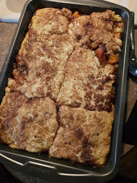 I let the peaches ripen a bit too much so it's a little mushy but tastes great! Biscuit topping with some extra sugar, egg washed with cinnamon sugar on top.