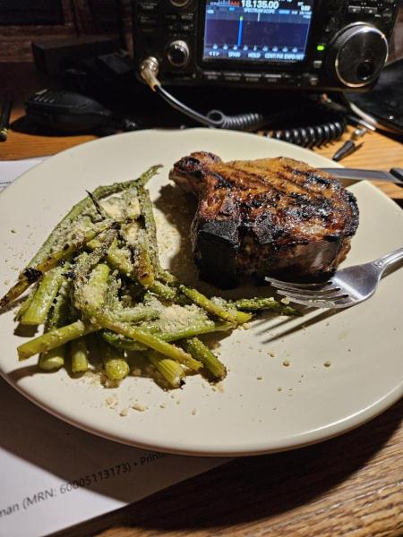 Grilled a couple of thick (1.5") pork cops tonight on the gas grill along with packet asparagus (butter and coarse garlic powder). Light smoke with some apple chips in a foil packet.I rubbed the chops with a dry rub last night, sure wish I could remember what I put in the rub. Onion and garlic powders for sure along with salt and pepper.
