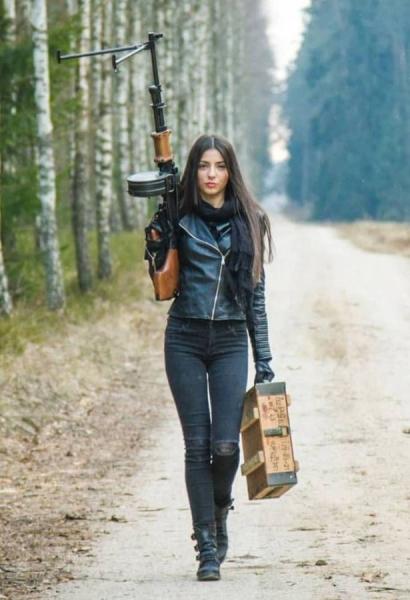 No skin here, but they're certainly babes with GUNS. (And small arms)